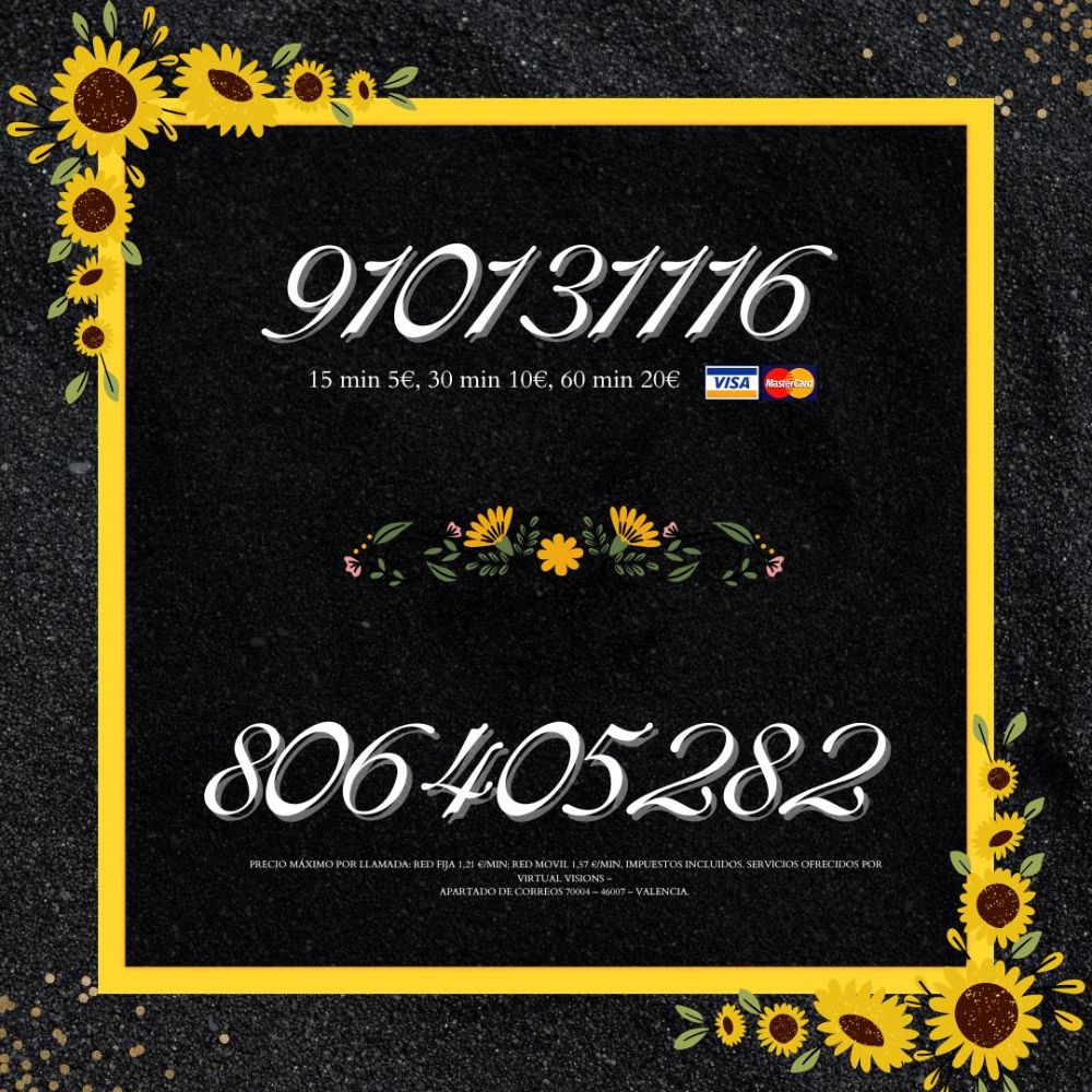 ¿Buscas respuestas claras y orientación en tu vida? ¡Consulta ahora mismo con nuestros expertos en Tarot y Videncia a precios imbatibles! Por tan solo 5€ obtén 15 minutos de lectura, o extiende tu sesión a 30 minutos por solo 10€. ¿Quieres sumergirte aún más en el mundo de las predicciones? ¡Aprovecha nuestra oferta de 60 minutos por solo 20€! No dejes pasar esta oportunidad de descubrir lo que el destino tiene reservado para ti. Llama ya y comienza tu viaje hacia la claridad y el bienestar.