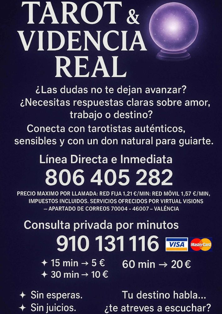 Descubre los secretos del universo con nuestras lecturas especializadas en Tarot, Astrología y Videncia. Sumérgete en un viaje místico donde las estrellas te guiarán hacia el conocimiento de ti mismo y tu destino. Nuestros expertos te ofrecen claridad, orientación y respuestas a tus preguntas más profundas. Deja que la magia del Tarot desvele los misterios del presente, la Astrología te revele los ciclos cósmicos y la Videncia te conecte con tu intuición interior. ¡Llama ahora y déjanos iluminar tu camino hacia la felicidad y el éxito!
